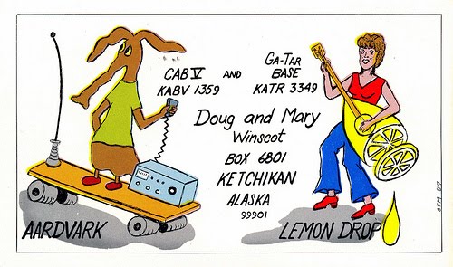 QSL cards are personalized postcards that were used as a record of contact between CB radio (and other two-way radio) operators. Think of them as a proto-internet, a social network made of sound and paper. They are a little bit postcard, a little bit cartoon/comic art, a little bit mail art, a little bit folk art, a little bit outsider/naive art, a little bit ephemera...